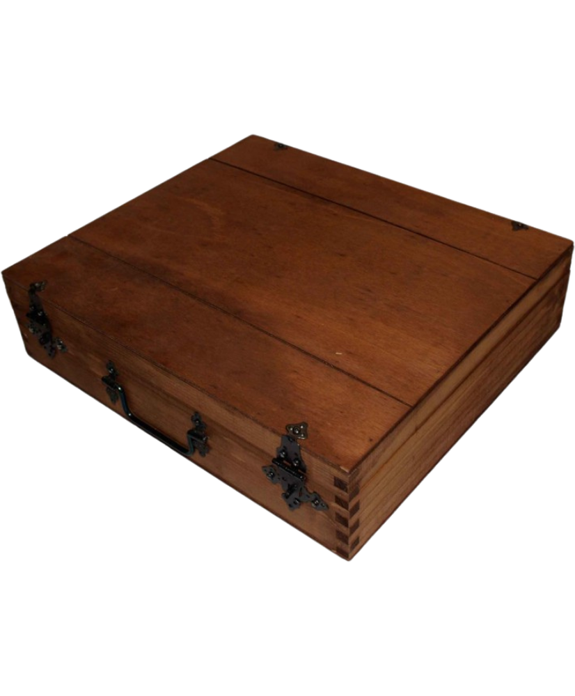 Maleta de fusta enfosquida per a 4 ampolles de cava. Apertura porta en vertical. Frontises i tancament metàl.lic