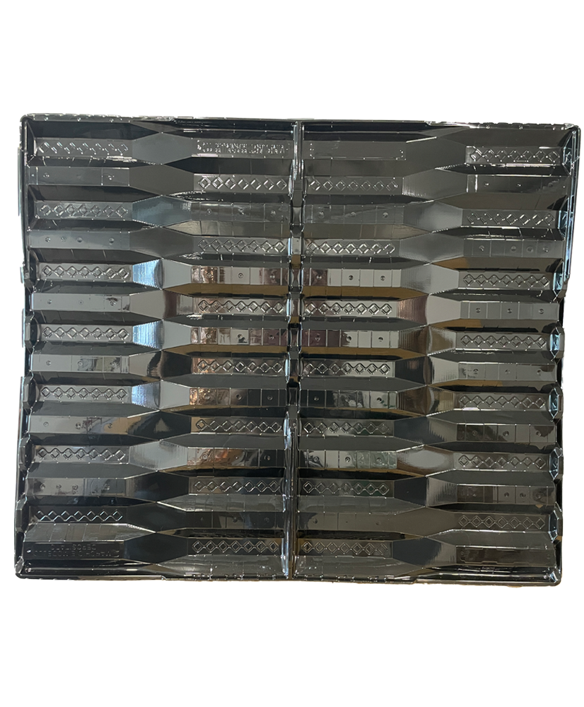 Can be stacked up to a height of 20 trays per pallet. Only a second pallet can be stacked high.