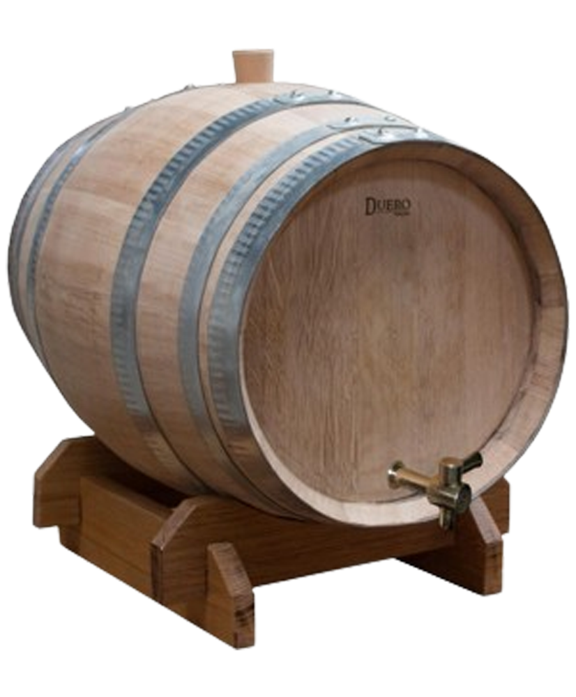 Barrica de roble americano 20 litros con pie y grifo disponibles para vinos o licores. Diseño artesanal en madera natural, funcional y decorativa a la vez.