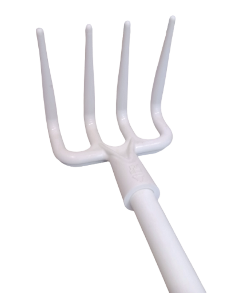 Râteau hygiénique pour usage alimentaire, de couleur blanc, adapté pour la vinification. Il est utilisé par exemple pendant les vendanges pour enlever les peaux de la cuve en acier inoxydable et séparer la partie liquide de la partie solide ou pour mettre la partie solide dans le conteneur à peaux.